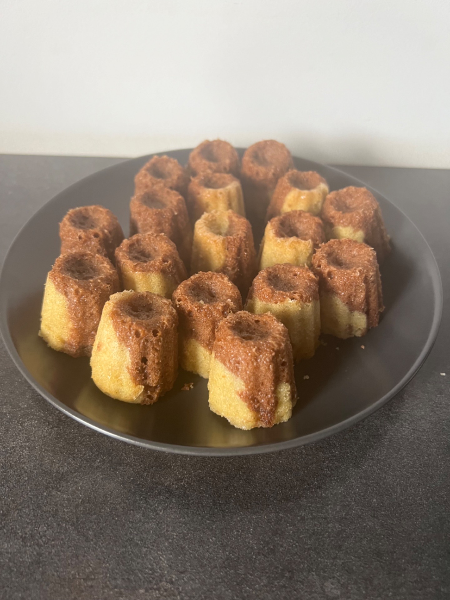 La semaine qui suivait, j’ai voulu tester à nouveau une nouvelle recette qui m’inspirait confiance et qui avait aussi l’air très bonne. Ces gourmandises qui ont une forme de cannelé n’ont pas du tout le même goût, car ils ont plus une texture moelleuse ressemblant aux madeleines et sont en plus de cela marbrés donnant un côté vanillé et chocolaté. Même s’ils étaient bons, je pense qu’il manquait un peu de croquant ou de croustillant, ce qui donnait une impression de trop mou pour chaque cannelé. Ensuite, je pense que cette recette ressemble fortement au goût des madeleines, ce qui m’a convaincu de ne pas choisir cette recette pour notre déjeuner de fin d’année, comme j’avais déjà choisi de ne pas faire de madeleines.