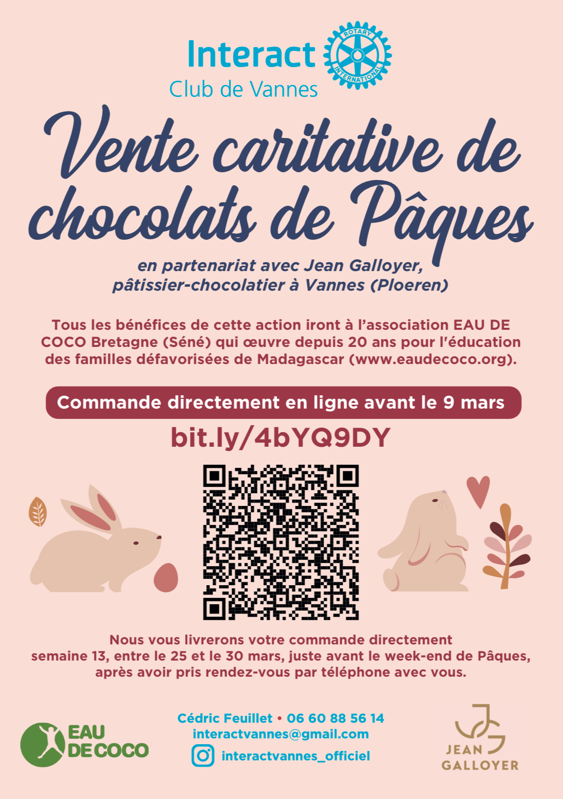 Pour préparer Pâques, nous avions décidé de faire une vente de chocolats afin de récolter un maximum de dons pour l'association " Eau de Coco" située en Bretagne à Séné, une ville des environs de Vannes. Pour cela, nous avions décidé de faire un partenariat avec un chocolatier et de pouvoir avoir des prix réduits et donc avoir une plus grande marge de dons.