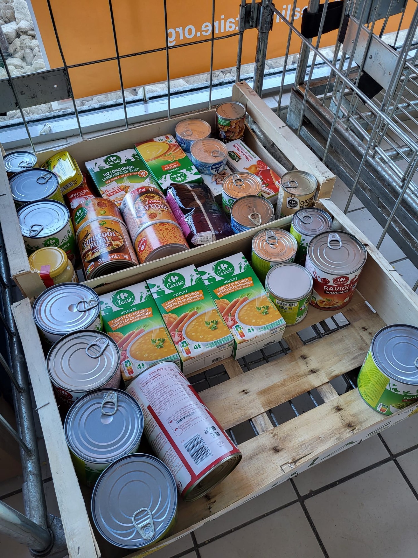 Durant ce début d'après-midi, un monsieur a fait un geste très généreux, en faisant don de tout un cadi complet de nourriture, en nous expliquant que lui aussi avait été dans cette situation et que justement il avait réussi à s'en sortir grâce à ces dons, ce qui lui avait permis de pouvoir se nourrir quand il n'avait pas les ressources financières pour le faire. C'est pour cela qu'il voulait à son tour aider les personnes dans le besoin en espérant qu'ils puissent s'en sortir comme il avait réussi. Son geste de générosité a été d'une telle belle intention, qui je pense me marquera pour toute ma vie. J'ai donc voulu moi aussi faire un don à mon échelle, en allant faire des courses pour en faire don, en prenant des aliments en conserve pour qui puissent être bien conservés.