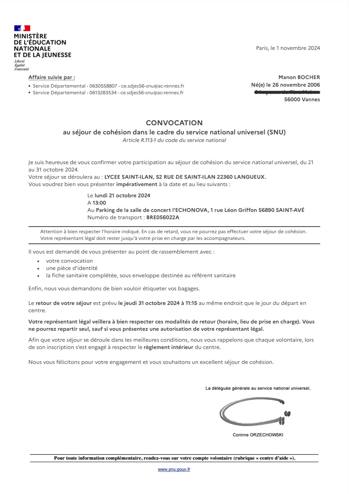 tout de suite inscrite. Au tout début, j'ai été de nouveau remise sur liste d'attente tellement il y avait de la demande, mais heureusement au début du mois d'août j'ai reçu un mai du SNU pour me confirmer mon séjour, jusqu'à ce que je reçoive ma convocation.